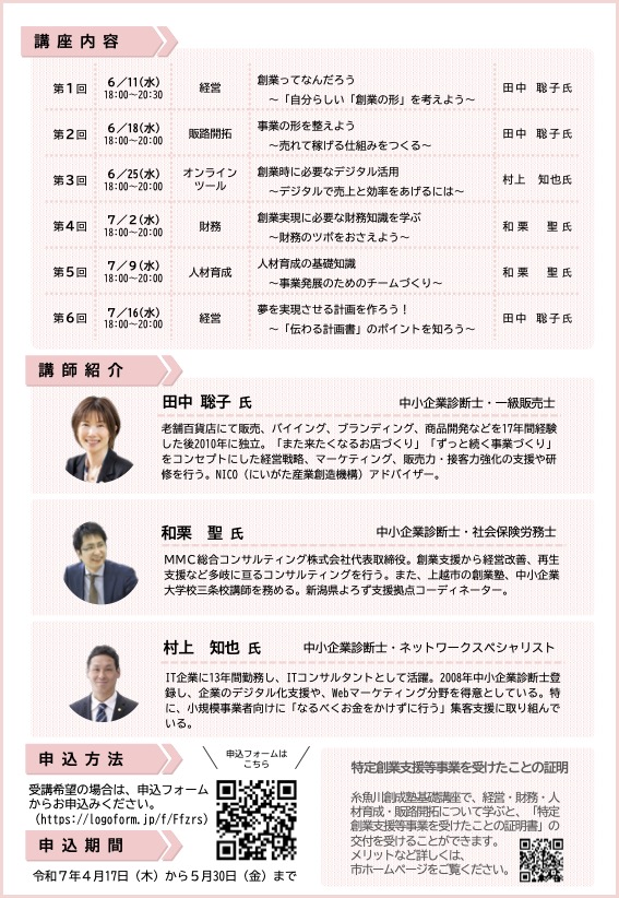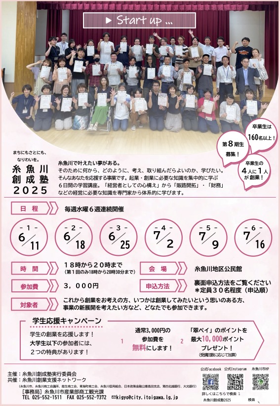2025年12月4日 / 最終更新日時 : 2025年12月4日 toretore チラシ 糸魚川創成塾2025 糸魚川で叶えたい夢がある。 そのために何から、どのように、考え、取り組んだらよいのか、学びたい。 そんなあなたを応援する事業です。起業・創業に必要な知識を集中的に学ぶ 6日間の学習講座。「経営者としての心構え」から「販路開拓」・「財務」 などの経営に必要な知識を専門家から体系的に学びます。 Follow me! BlueskyCopy